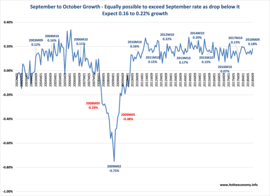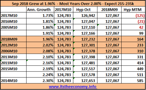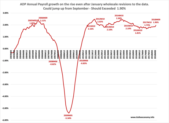 Currently we have added 1.834 million payroll jobs this year. This means that we are averaging just over 203,000 jobs a month. We are trending between 2013 and 2015 in ADP payroll growth. We are doing better than 2016 and 2017, when only 1.6 million jobs were added through September, even after jobs were shifted backwards from 2018 to 2016 and 2017. We only need to average 188,000 jobs to hit 2.4 million and 220,000 a month to hit 2.5 million The current year growth rate is 203,000 a month, so this should set the bottom for expectations between 188,000 and 203,000.