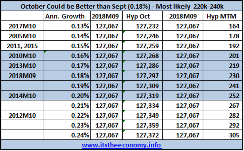 The data indicated that this month could be a trick, with 164,000 to 192,000 jobs added, or a treat with 250,000 to 300,000 jobs added. This report will prepare the "experts" for good news or not so good news. Will the report "get political" and not produce a solid number right before the mid-term elections the following week? Will this report give President Trump another victory. All the data points to a value over 200,000 and less than 300,000 with an overlap in the 230,000 to 250,000 level, assuming that upward revisions to prior months data do not borrow growth from this month.
