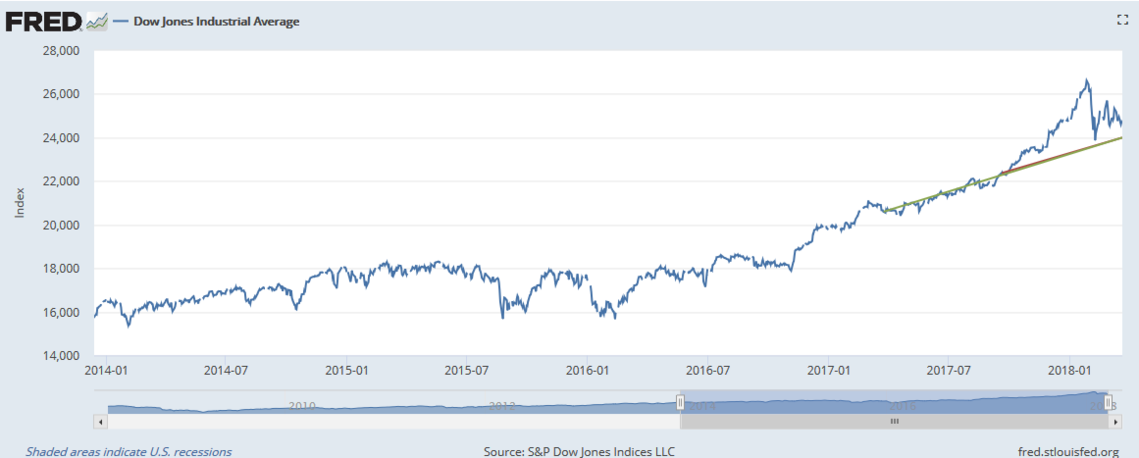 Today's decline was a bit ridiculous. There was a time this year where the thought was that the stock market, the Dow Jones Industrial Average, who easily eclipse 28,000 before the end of the Summer. The above graph displays why we should not be surprised at the recent downturn. The above graph shows the rate of growth from September 19, 2017 to March 22, 2018. The endpoints are 22,370 and 24,000. The DJIA added 1630 points or 8.85 points per day. If you look at the other line, between March 24, 2017 and March 22, 2018 the growth was 3401 points over 363 days, or 9.37 points a day. If we added 9 points a session, every session over the past 12 months, we would have ended today at 24,000. If we added 8.85 points a day, nearly nine points, since September 19 we would have just about cleared 24,000 for the first time today. We were growing at 9.89 points a day between March 24, 2017 and September 19, 2017. Are you worried about 8.85 points a day versus 9.37 points per day or 9.89 points a day? Really? What if I told you that we might gain 3200 points by this time next year? Dow 27k anybody? That would be a 13% growth rate. Not too shabby.