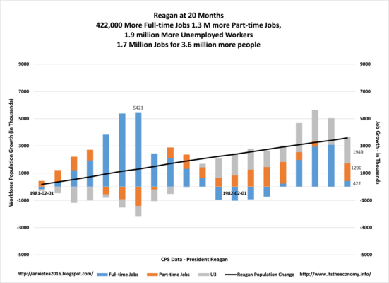 Former President Reagan added 3.6 million participants for 3.6 million more potential workers. The addition of 1.3 million part-time jobs, 422,000 full-time jobs, and 1.9 million unemployed workers means that there were 3.6 million more participants. The participation rate started to increase under former Presidents Reagan and Clinton, plateaued under George W Bush, and declined under Bush and Obama. How did former President Reagan grow the population more than former Presidents Clinton and Obama? Eventually there will be a spike in population under Clinton and Obama.