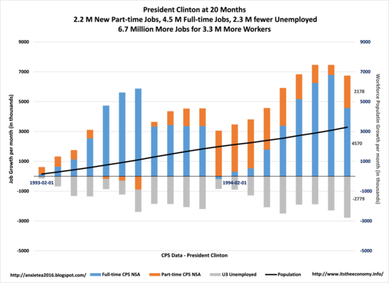 Former President Clinton oversaw the creation of 6.7 million jobs and the reduction of unemployed workers. The interesting point here is that he oversaw the addition of only 4.5 million full-time jobs. While former President Clinton oversaw a larger increase in total jobs, two thirds of the jobs created were part-time jobs. Also note that he only saw 3.3 million workers added to the population. What is it about Republican Presidents adding 4 million workers and Democrats only adding 3 million workers? It is also important to note that it was "harder" for former President Clinton to add 6 million jobs for 200 million workers than it has been for President Trump to grow 6 million jobs for 258 million potential workers.