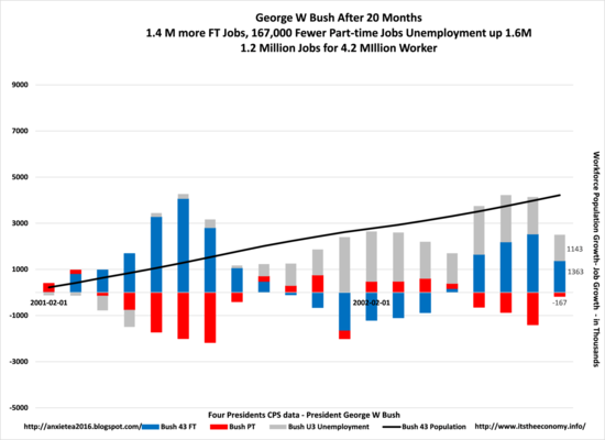 Former President Bush saw an increase in Full-time jobs and an increase in unemployed workers after 20 months in office. This President also saw an increase of over 4 million workers in the workforce population, almost identical to what has been seen with President Trump. Former President Bush will see his job creation peak during July of 2007, and it will almost return to that level during July 2008.