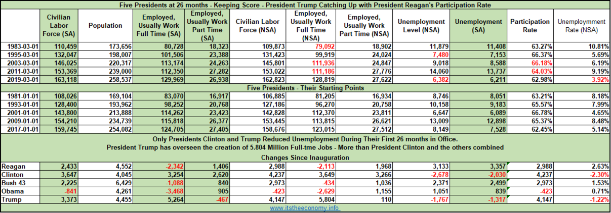 President Trump is doing something only two other Presidents have done during their first 26 months in office, boost the participation rate. So far he is also doing something than former President Clinton achieved during the early years of his Presidency: Cut the unemployment level and boos full-time jobs. But what about the final two years of the Obama administration and the first two years of the Trump administration. Been there. Done that. President trump created a million more jobs. Former Presidents Obama, Bush, and Reagan were able to win re-election with weak jobs data. What is going to happen over the next year and six months?
