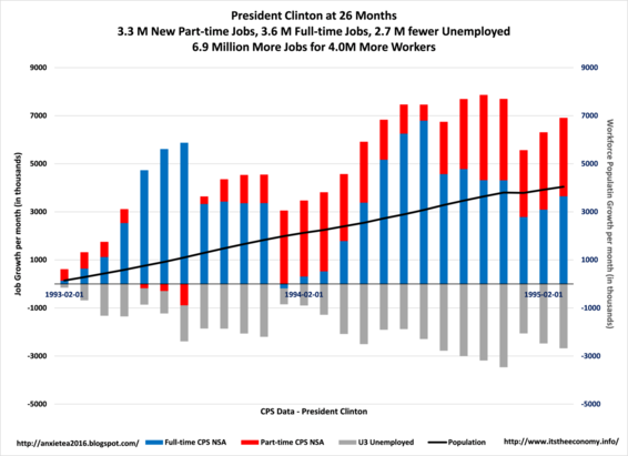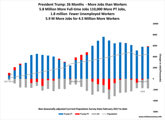 President Trump has added more jobs than workers during his first 26 months in office. This is not small feat. Normally the party of the President changes when the economy is showing weakness. So far President Trump has overseen the addition of 5.8 million full-time jobs and 110,000 part-time jobs. Only President Trump and Former President Clinton managed to added Full-time (FT) jobs, cut unemployment, and add more jobs than potential workers during their first 26 months in office. Former President Clinton oversaw the addition of 3.6 million FT jobs and 3.3 million part-time jobs. This means that the former President added more total jobs while President Trump added more full-time jobs.