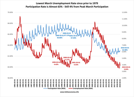 We had the lowest March unemployment rate since under these five Presidents this month. The non-seasonally adjusted U-3 unemployment rate was 3.92%. We did not have the lowest march U-3 unemployment level this March. We had lower March U-3 unemployment during March 1999 and March 2000. If you compare the unemployment rates of the prior Presidents you will find
