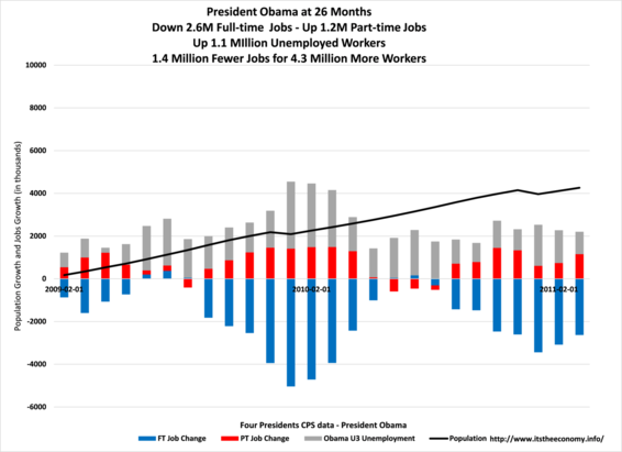 Former Presidents Obama, George W. Bush, and Reagan had fewer full-time jobs and more unemployed workers after 26 months in office then were present at inauguration. Former President Obama had 2.6 million fewer full-time jobs, former President Regan had 2.1 million fewer full-time jobs, and former President Bush had 434,000 fewer full-time jobs after 26 months in office than when they started. All three former Presidents saw unemployment rise during their first 26 months in office. Former President Reagan had 2.7 million more unemployed workers, while Bush had 12.1 million more unemployed workers and Obama had 1.1 million more unemployed workers after 26 months in office.