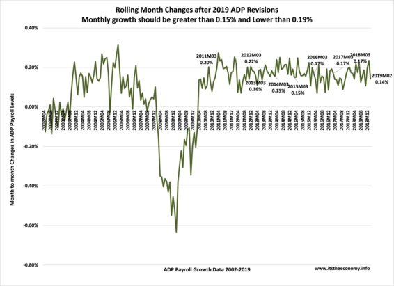 The ADP Payroll data was reporting better than 2.00% growth during January 2018, until the February 2018 Payroll Report. This column produced an article during January 2018 with a projected strong February growth based on this growth rate. The systematic revisions shifted growth from 2018 back to 2016 and 2017. January 2018 was originally growing at 2.27%. The 2018 revisions meant that we grew only at 1.80% during January 2018. This is important because even after the February 2019 revisions we have been growing in excess of 2.05% since September.