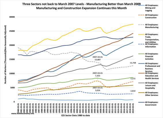 Three sectors have not returned to their pre-recession worker levels. Two are working on it. Manufacturing and Construction have almost returned to their 2007 levels of workers. Information Technology has been on a nearly two decade slide. There are more workers in Manufacturing than there are workers in financial Actives, OS, Construction and Mining.