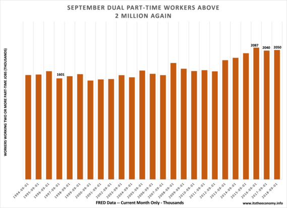 This is the third straight September with over 2 million workers working two part-time jobs. There were 736,000 men working two PT jobs this month and 1.315 million women working two PT jobs.