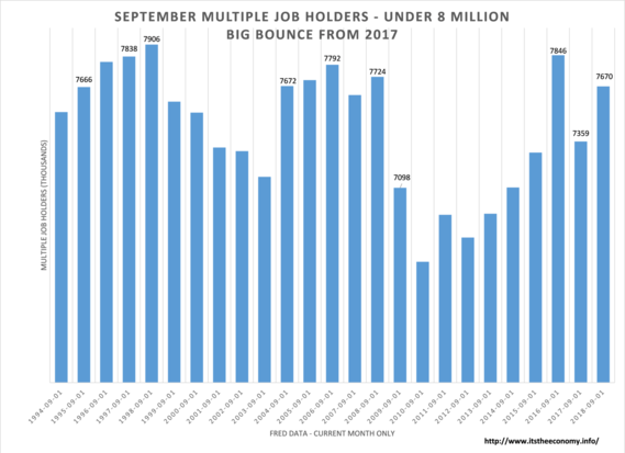 The total number of Multiple Job Workers Jumped from the September 2017 level. The trend since 2010 was for an increasing number of MJH workers, in general. There was a spike in MJH during September of 2015 and a significant drop during September 2017. This may because there has been an increase of 6.5 million full-time jobs and a decrease of 2.5 million part-time jobs since the January Jobs report and the inauguration of President Trump. We have 4.2 million workers working a primary FT job and PT secondary job. This is higher than last September and lower than September of 2015 and lower than September of 2008. It is also lower than the September totals for 1994 through 1998. Data collection started during 1994.