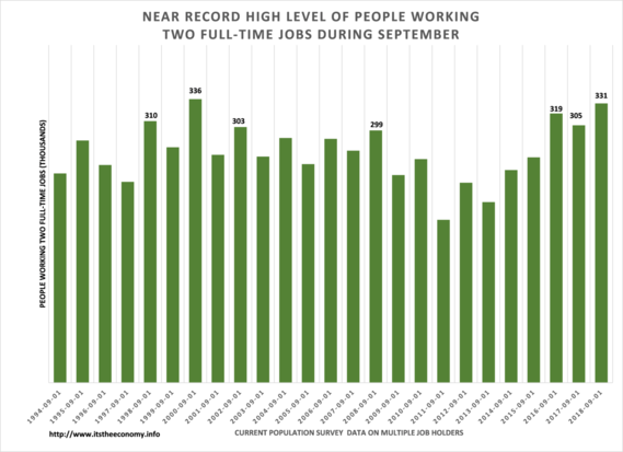 This was the second most number of people working two full-time jobs during the month of September. We saw 331,000 people working two FT jobs this month. There were 201,000 men working FT FT and 130,000 women working FT FT.