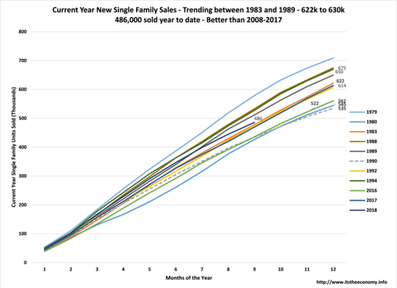 The Current Year Data is Better than 2008 through 2017. We have seen 486,000 units sold year to date. We saw 470,000 units sold through September 2017, 436,000 the same month of 2016, and 388,000 units sold through September 2015. There were 614,000 units sold during 2017, so this means that we could see 627,000 units sold this year. That would keep up between the levels recorded during 1983 and 1989. If we average the monthly sales out and project into the future to December we could see 648,000 units sold. The rolling year (RY) data, the sales during the prior 12 months is 630,000 units. If the CY data is greater than the RY data then the economy is expanding.