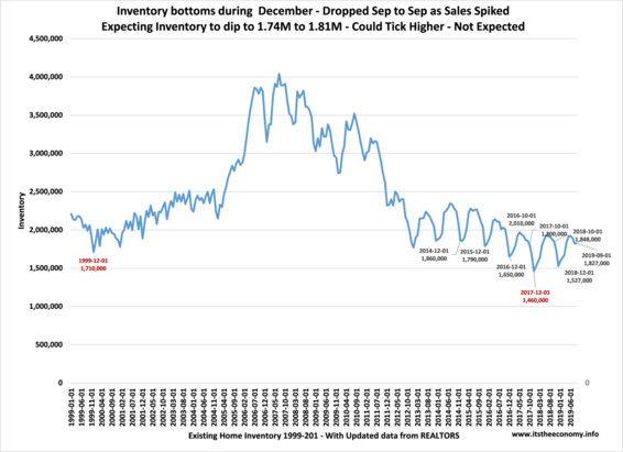 Inventory normally is expected to grow year to year and possibly decline month to month during October. These are mutually exclusive this year. We cannot both decline month to month and rise October to October. last year we had 1.848M units in inventory while last month we only had 1.827M units in inventory. Inventory was expected to decline significantly last month and remained relatively stable. We appear to have ht bottom during December of 2017. The "annualized inventory" is expected to decline. Inventory "peaked" during June this year, for single family homes, at 1.700 million. The seasonally adjusted annualized sales data peaked during August. September to October single family homes dropped by 30,000 units last October. Condominium inventory fell by 3,000 units last October. If we record similar drops in inventory this October we will fall below 1.800 million units. We may be fortunate if we see 1.808 million units in inventory. It is possible for a spike to over 1.850 million units if people placed their homes on the market over the Labor Day weekend in hopes for a quick sale, in an effort to take advantage of low inventory levels. Don't be surprised if there is an uptick or a downturn in inventory. We may see a level around 1.825 million units. Inventory could drop October to October and could be up month to month.