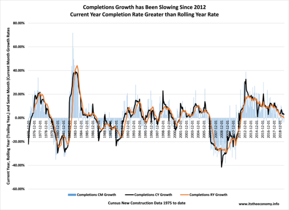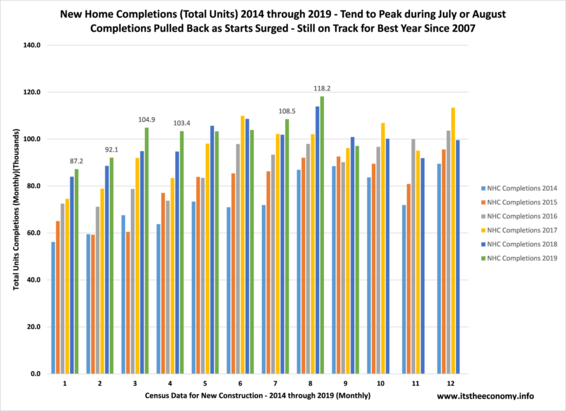 Completions are expected to continue their march upward from last year's levels. We saw 106,900 October completions during 2017 and 100,200 October completions during 2018. Completions have exceeded their 2018 counterparts six of the past nine months. The RY CY CM data for Completions looks very similar to the New Home Starts Data. Last year was the "Year of Starts." This year has been the "Year of Completions. We could see the CY and RY curves bend upward during the next few months.