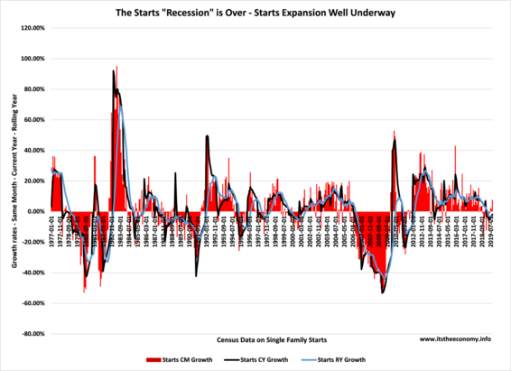 Starts were sluggish earlier this year - picking up the pace, now. We appear to have "hit a wall" with regard to October Starts. We have had roughly 75,000 NSA Starts during October the past tree years. We had 75,400 during 2016, we had 75,700 Starts during October 2017, and 74,900 NSA Starts last October. We used to have 100,000 or more Starts during the month of October from 1992 through 2006. Rolling year growth had gone negative. The rolling year grow this the change in Starts during the past 12 months from the growth compared to the same month last year. Current year growth has been slowing compared to the same month last year. The Same month data has been exceeding the same month last year during the past three months. This is fairly normal, as can be seen in the Rolling Year (RY,) Current Year (CY,) Same Month (CM,) growth graph.