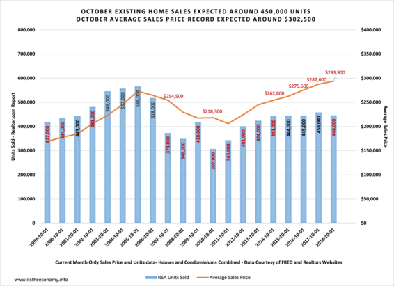 Units sold could increase or decline month to month and October to October. Inventory impacts sales. You cannot sell what is not for sale. We do have four months of inventory available for sale. we could see one third of the inventory sell this month, or roughly 450,000 units sold, just on absorption. Month to month data indicates that rough 425,000 to 475,000 units sold this month. October to October sales data indicates that we could see 432,000 to 472,000 units sold, or roughly 452,000 units sold. Right now we are trending between the 2015 year to date (YTD) and the 2018 YTD. Their sales levels were almost identical at 444,000 and 446,000 units respectively. We had 446,000 units sold last month and 452,000 units sold last October. In theory, we could increase month to month and decline year to year. All of the data points to 450,000 except....