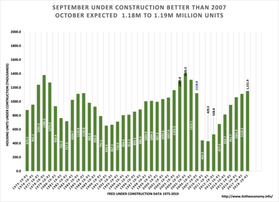 Expectations are for Units Under Construction to grow month to month and October to October. This month the Under Construction data is expected to edge higher from last month's 1.178M units and last year's 1.151M units to between 1.179M and 1.192M units. This will appear as a relatively significant spike.