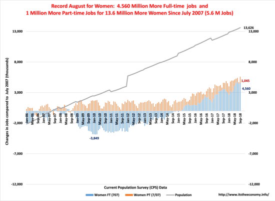 (Oct. 8) The "War on Women" was a talking point of the 2012 and 2016 Presidential elections. There are interesting tidbits to be found in the CPS data as the jobs data pertains to men and women. "Women Recorded September Job Surge" details the continued expansion of the female workforce. Women still work more part-time jobs than men, men still work more full-time jobs than women, and women are still participating at a lower rate than men. Women added over 900,000 non-seasonally adjusted jobs this month.