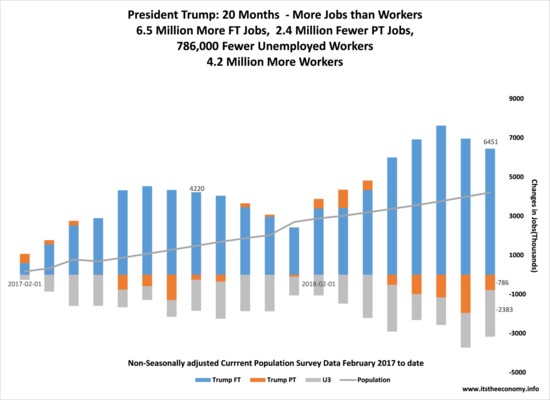 (Oct. 8) The September jobs report was unloved because the upward revisions to the August Current Employment Statistics (CES) data reduced the September jobs creation data. The second data set used to create the jobs report is the Current Population Survey (CPS) data on full-time jobs, part-time jobs, unemployed workers, and workforce participation. "Five Presidents at 20 Months: Yowza" detailed the huge surge of non-seasonally adjusted (NSA) full-time jobs under President Trump, and the significant drop in unemployed workers. Only former President Clinton managed to do this after 20 months in office.