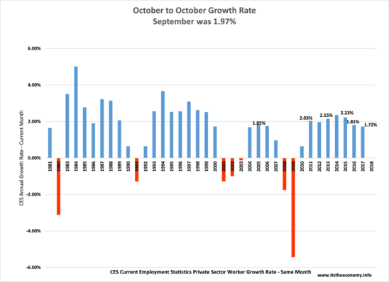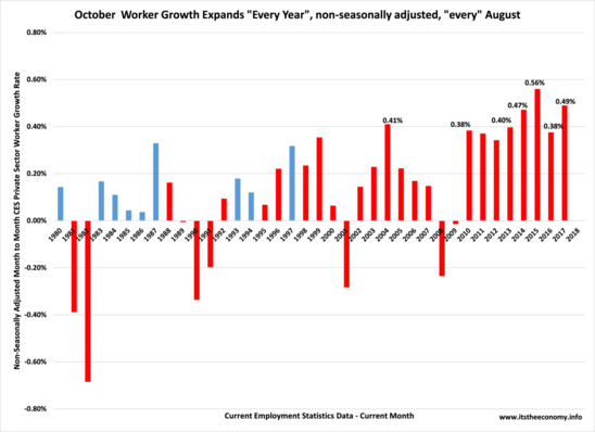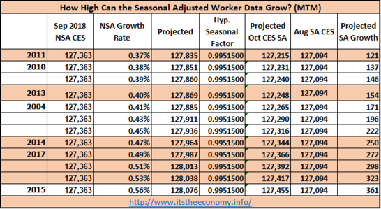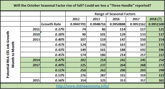 The combinations and permutations of seasonal factors and growth rates gives an insight as to what could be expected. The higher the seasonal factor the higher the seasonally adjusted data. If we grow as we did during 2015, month to month, then we should see a 300,000 jobs report number. The thing is that this would require a seasonal factor in line with what we saw during 2012, 2013, 2016, or 2017 to be used. If the seasonal factor from 2015 was used that would generate a SA CES value of 282,000, without revisions. If we grow at the rate we did during 2013, then we would expect a much lower number. If we grow at the same rate as we did last year and use the same seasonal factor then we would add 268,000 SA CES private sector workers. We know that we are growing faster than we were last year.Expect a Strong Private sector number of 250,000 to 300,000 before revisions. Expect upward revisions to August and September to steal some thunder from October. There is also the potential that there may be massive revisions to the data from January through September in order to maintain a "nominal" growth for October.