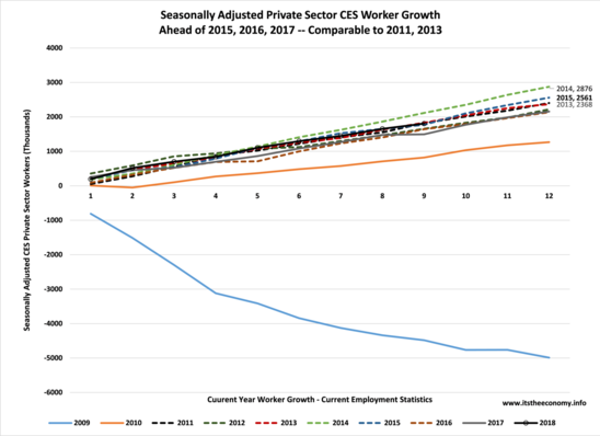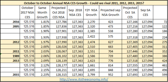 This year through September we have added 1.8 million SA CES workers. This places us ahead of where we were during 2015, 2016, and 2017.We are not far off the track of 2014, and we would be well ahead of that mark except for the revisions to the data this past January. This sets the "floor" for expectations at 200,000 per month.Last year we had 125.516 million SA CES workers during October. If we grow at 1.97% that would place us at 128 million workers - an increase of 637,000 seasonally adjusted workers. That number, while possible, based on the growth rate that we saw during 2015, would have a hard time being explained in the media.