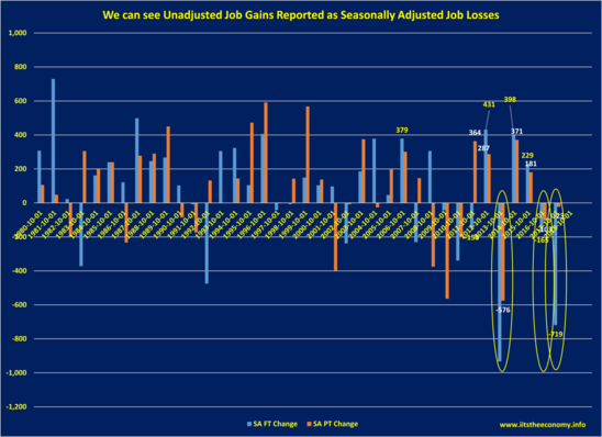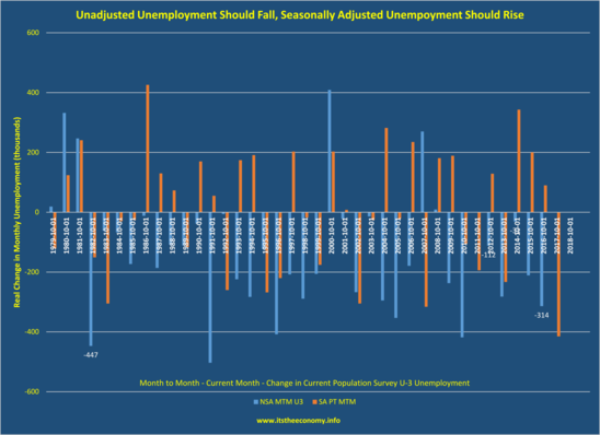 The monthly employment situation report, or jobs report, is created using two different databases: the Current Population Survey (CPS) data and the Current Employment Statistics (CES) data. The CPS data measures the workforce population, the number of full-time and part-time jobs, and the number of unemployed workers. The CES data measures workers in the workforce. The headline non-farm payroll data includes government workers. The total private sector number, the one used to monitor former President Obama's "jobs streak" was the seasonally adjusted CES total private sector worker data that excluded government workers. Each data point in the CES and CPS data sets have non-seasonally adjusted and seasonally adjusted components. The seasonal factors used to convert the non-seasonally adjusted (NSA) data to the seasonally adjusted (SA) data change by data set, class, month, season, and year. The data used to convert NSA unemployment (U-3) to the SA U-3 can make a recorded drop in NSA U-3 be reported as a spike in SA U-3. We have been in a period of time where unemployed workers and part-time workers are finding full-time jobs