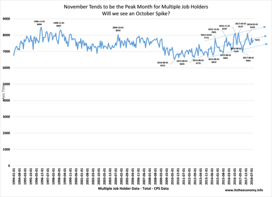 Dual Job Workers may increase from last month and decline from Last October. Multiple job workers tend to peak during the final quarter of the year. Some years the total number of multiple job workers, or multiple job holders (MJH,) peak during October, some years it is November, some years it is December. The overall trend is higher from the same month of a preceding year to the following year. We already have 4.2 million workers working a FT job and a PT job. It is expected to rise. We already have 2.05 million workers working two part-time jobs. That number could decline. Last year we had 1.770 million PT PT workers. The number of people working two FT jobs could fall from last month's 331,000 and remain above last October's 295,000 FT FT worker level. The statistical oddity is the number of people working a "primary" part-time job and a "secondary" full-time job. These may be seasonal FT jobs that only last through the end of the year. Will the total number of multiple job holders breach the eight million mark as it did during October of 1996, 1997, 1998, 2004, and 2016? That would require a spike of 300,000 MJH workers. Will we eclipse the eight million mark during November? December? All of the Above?