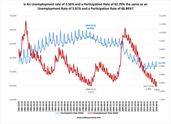 Workers are one thing, Jobs are Another thing. This section could also be called "Participation Matters." The participation rate is the fraction of the population that either has a full-time job, a part-time job, or is officially unemployed. Unemployed workers may not have had work recently, they might not even be receiving unemployment benefits recently. These unemployed workers are workers who are out of work who want to work. We had an unemployment rate, NSA, last month of 3.56%. This was a lower NSA U-3 unemployment rate than we had had since January of 1980. The problem is that while the NSA U-3 rate was lower than the 3.61% U-3 unemployment rate of October 2000, so was the participation rate. The NSA participation rate of September 2018 was 62.70% The participation rate during October 2000 was 66.86%. If last month was "full-employment" with 62.70% participation then we must have had "full-er employment" during October of 2000 and "full-est employment" during the Summer of 1997when the participation rate was 68.09% and the U-3 rate was 5.05%.