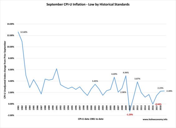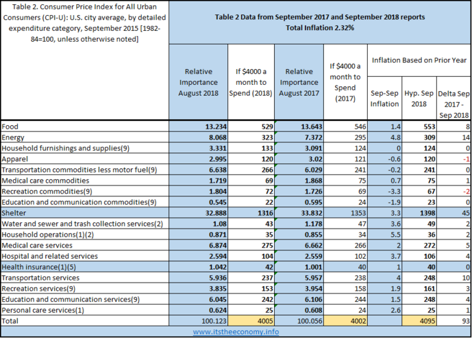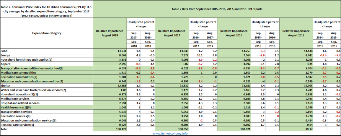 The Consumer Price Index (CPI) data was released today. The CPI_U inflation rate came in at 2.28% compared with 2.23% last year. This is a "normal" rate of inflation. We are seeing commodity deflation and service inflation.We see it again. We have been seeing Shelter Inflation. We are seeing it again. We had energy deflation during 2015 and 2016. We have seen energy inflation during 2017 and 2018. There is, again, some hidden medical insurance inflation with the weighting of the health insurance rising, again, from 1.001% to 1.042% If it is taking up 4% more of the relative importance (1.04 versus 1.00) then the inflation is being masked. Shelter Inflation is fairly constant at 3.3%. It was 3.2% during September 2015, 3.4% during September 2016, 3.2% during September 2017, and 3.3% this month.