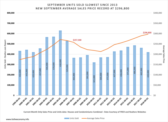 The September Real Estate forecast article also projected that we should see total units sold fall between 460,000 to 480,000 units, based on the current year data, the month to month data, the trailing year data, and the same month data. It also projected that we would set a new September Average Sales Price record between $298,000 and $301,000. Remember that anything above $289,600 would be a record for the month of September. The big question for the units sold was what would we see as the inventory number. Inventory was expected to drop below the 1.92 million units we had during August, as it normally falls during September. It was also anticipated that it should be higher than last September's 1.86 million units. What was recorded and was was report in the National Association of Realtors article "Existing-Home Sales Decline Across the Country in September?"
