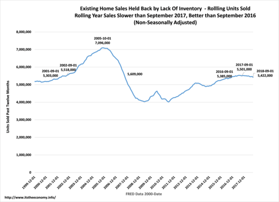Rolling units sold are down from September 2017 and up from September 2016. The 5.422 million units is better than we had during 2001 and slower than we had during 2002. This could be because inventory was lower than any other September other than September 2017.