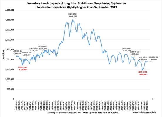 The September Existing Home Inventory edged slightly higher from last September's level. The inventory level did drop slightly from August to September. This is normal. The Realtors reported a drop in September Condominium units from 219,000 this August to 215,000 this month. Last September the inventory level was 217,000. The single family home inventory dropped from August's 1.69 million to 1.66 million. This is an improvement from last September's 1.64 million,