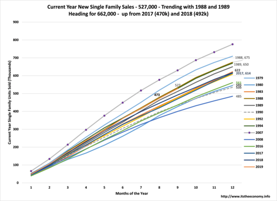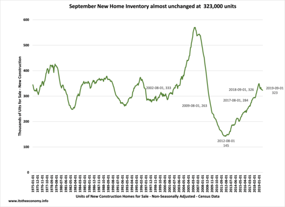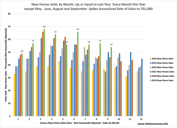 The annualized rate of sales is at 701,000 units - up from last year's 607,000 units. Last September the annualized rate of sales was 607,000. This is an increase of 15.45%. Some in the media may be lamenting the drop in annualized sales from August when it was 706,000 or June when it was 729,000. You can see from the 2012-2019 histogram that new home sales normally peak during March. This means that the annualized rate of sales should decline from March onward. We had a rate of 693,000 units during March.