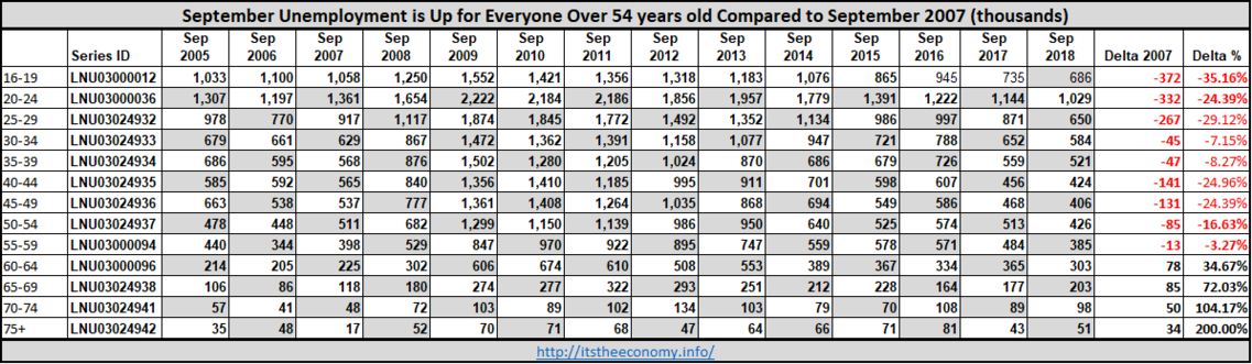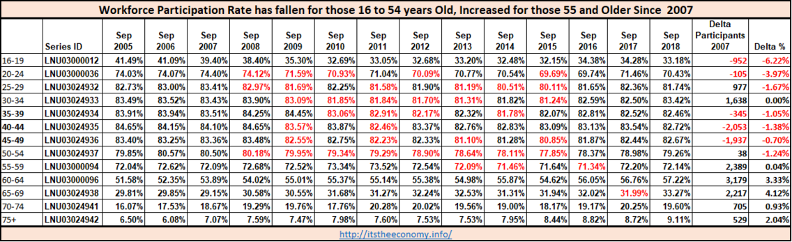 Participation is down, or unchanged, for those under 55 years of age. If we had the same participation rate that we had during September 2007 there would be one million more workers between 16 and 24 years of age participating. The participation rate for 60-64 year olds, 70-74 year olds, and those over the age of 75 years of age set a September high since 1981. This is going back to the Reagan Era and is covered under the Five Presidents Series.