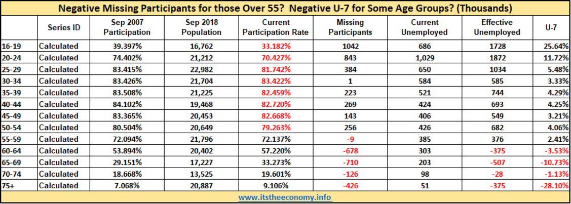 We are over-participating, or under-participating, by age groups. We are missing millions of participants under the age of 54. The ages who are "most under-participating" are those 16-19, 20-24, and 25-29 years of age. Those who are "over-participating" the most are those over the age of 60. The U-7 calculates the level of participants that we should have if we had the same participation rate this September as we had during September 2007. We are missing over 3 million participants under the age of 55. We have nearly 2 million more senior workers than we had during 2007.
