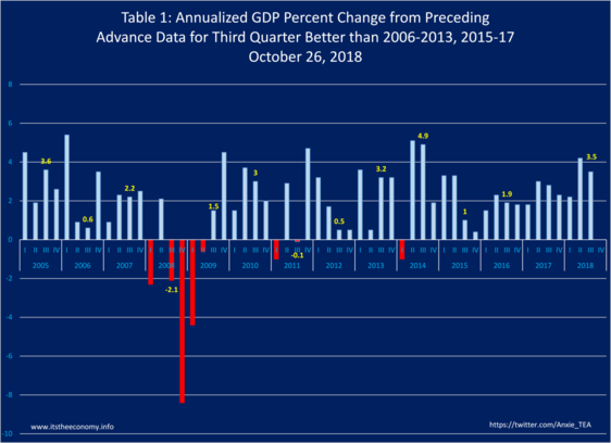The advance third quarter Gross Domestic Product (GDP) report was released today. There are four components to watch in the quarterly report: Personal Consumption Expenditures (PCE,) Gross Private Domestic Investments (GPDI,) Import/Exports, and Government Consumption Expenditures. The headline number is the annualized GDP. This is the hypothetical growth rate if we grew for four consecutive quarters at the rate of growth for this quarter. A second measure of GDP is the same quarter growth rate. It is important to also keep track of the revisions to the data. This year the GDP data was revised back to 1929, reducing the quarter to quarter growth rates for President Trump to under 3% for the third and fourth quarter of 2017 and the first quarter of 2018. What was recorded and what was reported in the Third Quarter Advance GDP Report? (BEA 18-56)