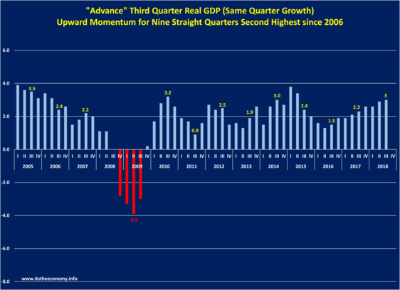 Same Quarter GDP growing faster for the ninth consecutive quarter. We have had 36 consecutive months of same quarter growth since the end of the recession. The growth in the economy was slowing from the first quarter of 2015 through the second quarter of 2016,. PCE is up 3.0% from the third quarter of last year. This is better than the same quarter of 2015 (2.4%,) 2016 (1.6%,) and 2017 (2.3%) GPDI is up 6.3% from 2017Q3. This follows a 2017Q3 same quarter growth rate of 6.8% and a 2016Q3 drop of 2.3% Exports are up 3.9% from 2017Q3. The prior data is 0.1% for 2015Q3, 1.2% for 2016Q3, and 2.1% for 2017Q3. Imports were up 5.7%, more than last year at 4.1% and slower than 2015Q3 when it was 6.2% Government Spending grew at 2.4% for the same period.