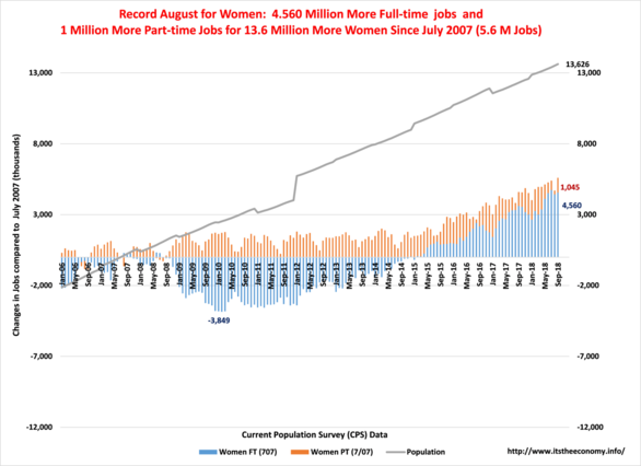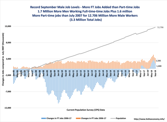 Men Shed Full-time Jobs and added part-time jobs this September. Men had a decline of 641,000 FT jobs, month to month, and an addition of 392,000 part-time jobs. It had taken longer for men to recover from their jobs recession. Women fully recovered at the beginning of 2015. Men recovered all of their lost full-time jobs, over 10 million of them, during the Summer of 2016, lost them again, recovered them and added to them during the Summer of 2017, and lost them again, before recovering and adding more Full-time jobs to their totals than they did during 2016 or 2017. This is a pattern that we saw during 2005, 2006, and 2007. Men are up 4.3 million full-time jobs and 1.1 million PT jobs compared to September 2007.