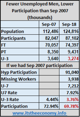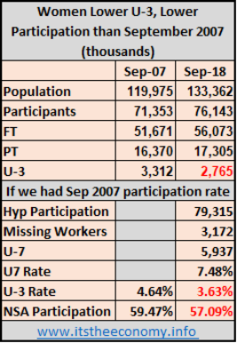 Women have seen their participation improve since September of 2015, and still dropped September to September. There is considerable discussion elsewhere that we are at "full-employment" because the total unemployment rate is under 4%. The problem is that the current 3.63% U-3 unemployment rate for women is with a participation rate of 57.09%. The last time we saw an unemployment rate this low during the Fall/Winter was December 2006 when the unemployment rate was 3.96% and the participation rate was 59.63%. A difference of 2.54% in the participation rate is significant. If we look at the September 2007 participation and unemployment rates we will see a similar situation. There is a 1.01% difference in the unemployment rate and a 2.38% difference in the participation rate. If we had the same participation rate as September 2007 then there would be 3.2 million more women in the workforce.