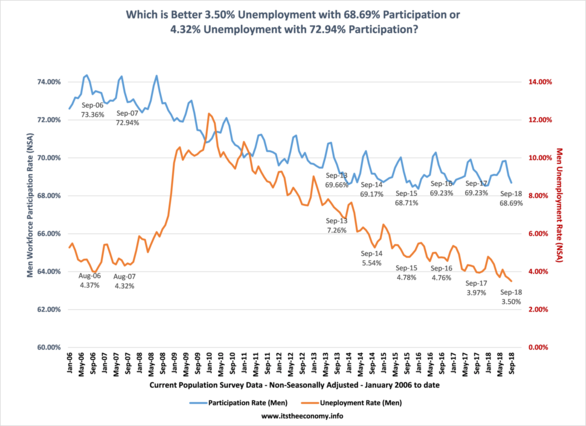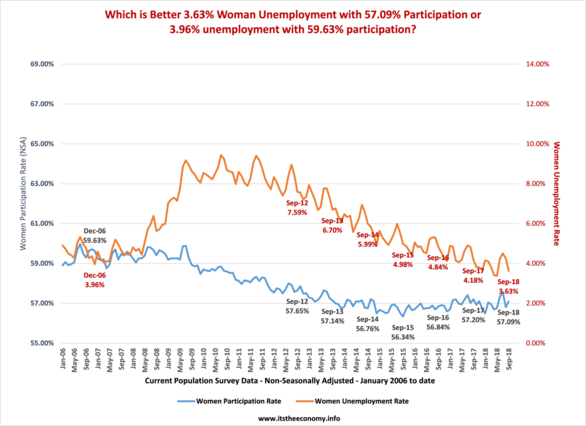 The September Jobs Report, or employment situation report, was released amidst the drama of the Brett Kavanaugh confirmation process. Men and women were watching to see if the new normal was going to be guilt by accusation. Was it going to be guilty until proven innocent? Was this just a "job interview," or a "trial by press/mob rule" situation? The jobs report was actually quite good. The seasonally adjusted (SA) Current Employment Statistics (CES) private sector number was a gain of 121,000. This normally would not be a great number. The August data was revised up by 69,000 workers which meant that 190,000 SA private sector workers were added to the economy. This and other information was covered in the article "September Jobs Soar." Wages rocked higher in all categories, according the the CES data, non-seasonally adjusted. The article "Five Presidents at 20 months" reported that there have been over 6 million full-time jobs added to the economy since President Trump took office, according to the non-seasonally adjusted (NSA) Current Population Survey (CPS) Data. The data being addressed in this article has to do with the "War on (Wo)Men" data. How are men and women performing in the New Economy?